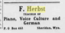 Professor Herbst's time in Sheridan, marked a significant period in his life, characterized by his role as the German and music teacher at Sheridan High School. This chapter of his life brought about several noteworthy experiences and contributions. From all the research, it is believed that Fernando Herbst only taught at Sheridan High School for about 15 to 20 years. He cannot be found after 1916 in any of the High School records located in the Wyoming Room.