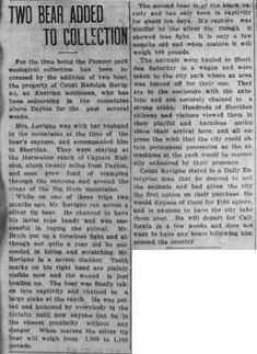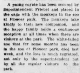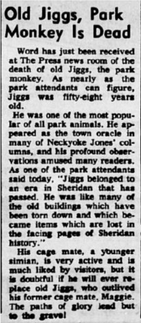 No one ever wants to see an animal die, especially ones that are so deeply connected and loved by the Sheridan community. Unfortunately, this happened here in Sheridan. Over the course of its existence, Pioneer Park Zoo bore witness to the passing of numerous animals, each with their own unique stories. Some animals met the inevitable denouement of their life cycles, while others confronted the unrelenting challenges inherent to a zoo of Sheridan's size, ultimately necessitating euthanasia on account of their health-related predicaments. Among the pages of newspaper headlines, the announcements of the deaths of some of these prominent animals were told. The city newspaper treated these animals just as if they were any of the residents of this great city. Most notably were Old Abe, The Big Monkey, Conga and Congetta, parents of Major Sheridan, and Old Jack, a grey wolf. Each of these stories, though a mere mention in the newspaper's ink, held a chapter in the rich tapestry of Pioneer Park Zoo's history. Some of the more notable can be seen below.